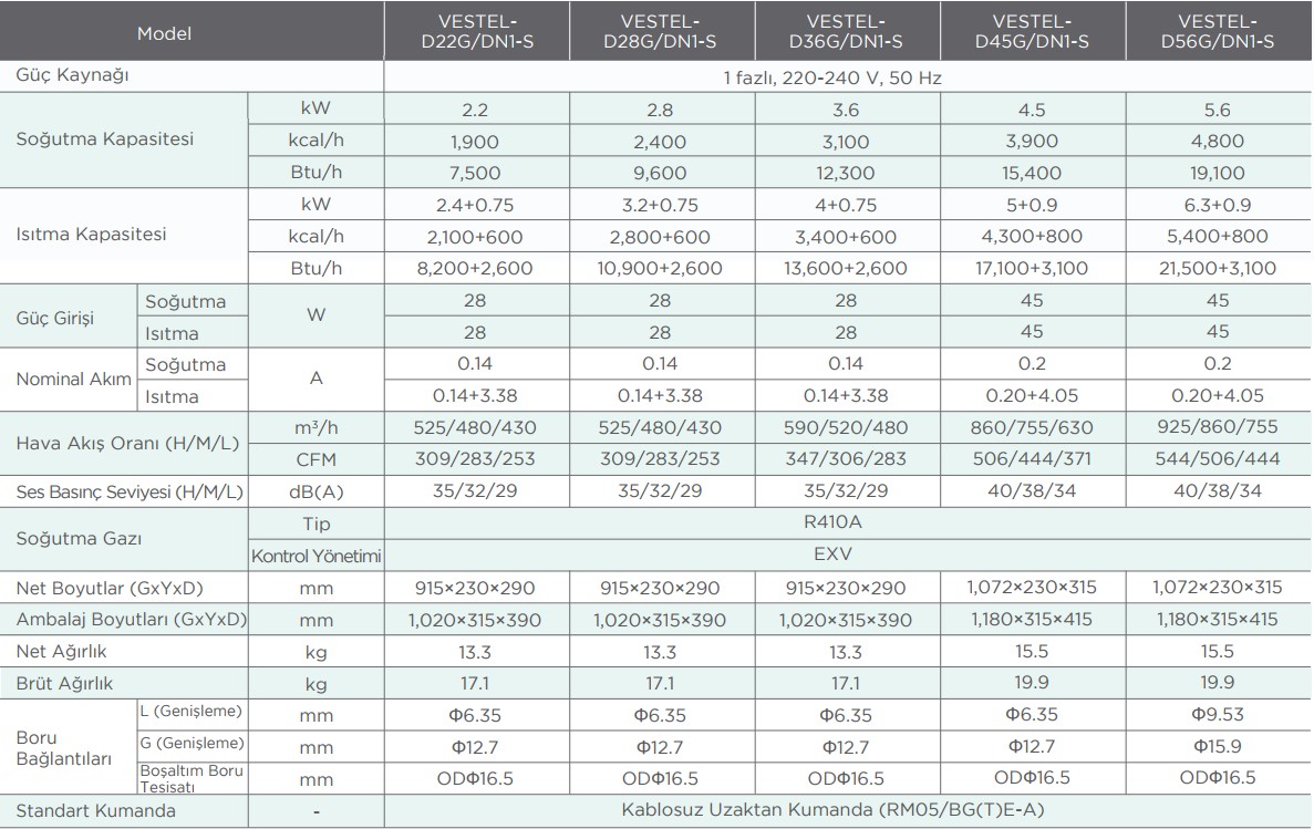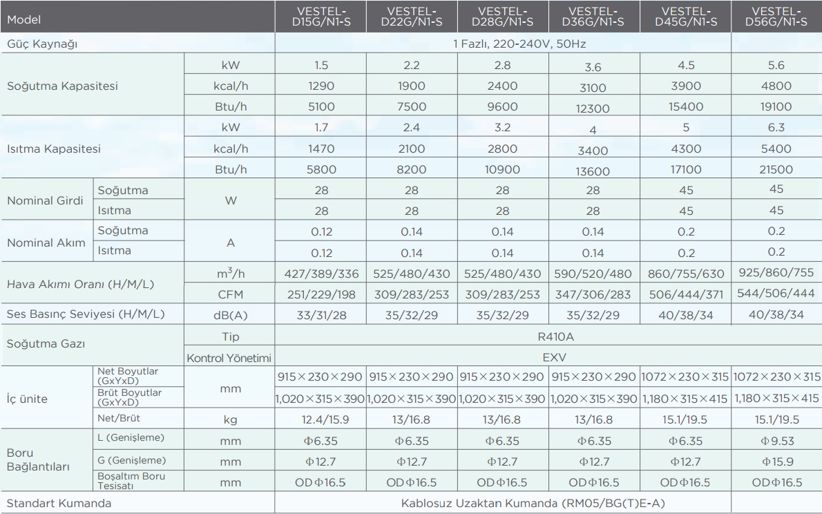 1. Nominal soğutma kapasiteleri şu şartlara bağlıdır: geri dönen hava sıcaklığı: 27°C KT, 19°C YT ve dış mekan sıcaklığı: 35°C KT, eş değer ref. boru tesisatı: 8 m (yatay)