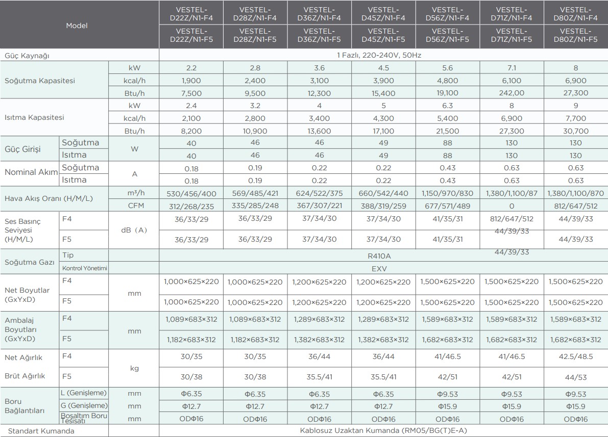 1. Nominal soğutma kapasiteleri şu şartlara bağlıdır: geri dönen hava sıcaklığı: 27°C KT, 19°C YT ve dış mekan sıcaklığı: 35°C KT, eş değer ref. boru tesisatı: 8 m (yatay)